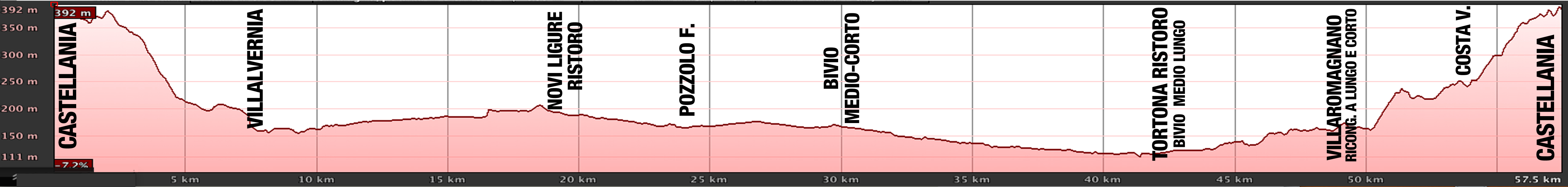 Fatta la scelta di pedalare sul PERCORSO MEDIO dopo la separazione dal PERCORSO LUNGO, nei pressi del RISTORO di Piazza Malaspina a TORTONA, si imbocca Via Emilia per poi svoltare subito dopo pochi metri a sinistra su Piazza Roma e superate un paio di rotonde, si prosegue in direzione Genova. Percorso Corso Don Orione, in direzione del Santuario della Madonna della Guardia (la grande statua della Madonna dorata che svetta di fronte sul campanile), il viale alberato a sinistra del Santuario e superati i campetti sportivi dell'attiguo Oratorio si SVOLTA A SINISTRA in Strada Viola Rosè Faceto. Attraverso questo tranquillo tratto di strada si raggiunge l'incrocio per MOMBISAGGIO svoltando a DESTRA in Strada Comunale Garibalda dove, al termine della brevissima salitella, è presente a sinistra, Villa Garibalda, una splendida villa padronale ora Bed & Breakfast, che fu di proprietà di Fausto Coppi negli anni '50. Proseguendo, dopo l'immissione nella curva e verso sinistra, sulla strada Provinciale 130 si procede verso VILLAROMAGNANO, per raggiungere e superare l'incrocio con semaforo a MOMBISAGGIO. Raggiunta e superata VILLAROMAGNANO, mantenendosi sulla strada principale, avviene il ricongiungimento con il percorso il PERCORSO CORTO e il PERCORSO LUNGO. Da questo momento tutti i tre tracciati percorrono la stessa porzione di Ciclostorica ovvero dopo il ricongiungimento si SVOLTA A DESTRA per iniziare successivamente il tratto di STRADA BIANCA simbolo dei "Colli di Coppi" e de' La Mitica: il tratto di Strada Bianca denominata "LA RAMPINA".Nella primissima parte una breve salita, inizialmente asfaltata per un breve tratto, ma che rapidamente si tramuta in STRADA BIANCA, sulla sommità si apre un magnifico panorama a 360 gradi fatto di vigneti, coltivazioni, dolci colline e borghi; in alto sulla destra vigila Passo Coppi, a poche pedalate dal traguardo di CASTELLANIA. La strada, a tratti in leggera discesa e dal fondo scorrevole percorre morbidamente tutto il crinale della collina per raggiungere MONTALE CELLI dove termina il tratto di strada bianca, quindi COSTA VESCOVATO, un paio di tornanti ed inizia la costante arrampicata verso Passo Coppi in località Boffalora e quindi verso l'agognato ULTIMO CHILOMETRO prima di arrivare al traguardo di CASTELLANIA.